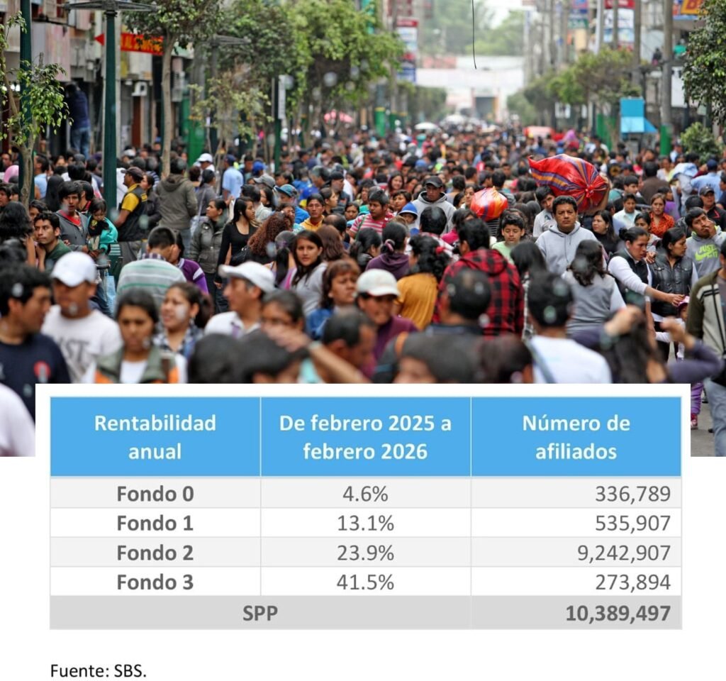 Cifras anuales de la Superintendencia de Banca, Seguros y AFP (SBS), arrojan que, entre febrero de 2025 y febrero de 2026, el Fondo 3 generó una rentabilidad de 41.5%, mientras que el Fondo 2 —donde se encuentra la mayor cantidad de afiliados— alcanzó un sólido 23.9%.